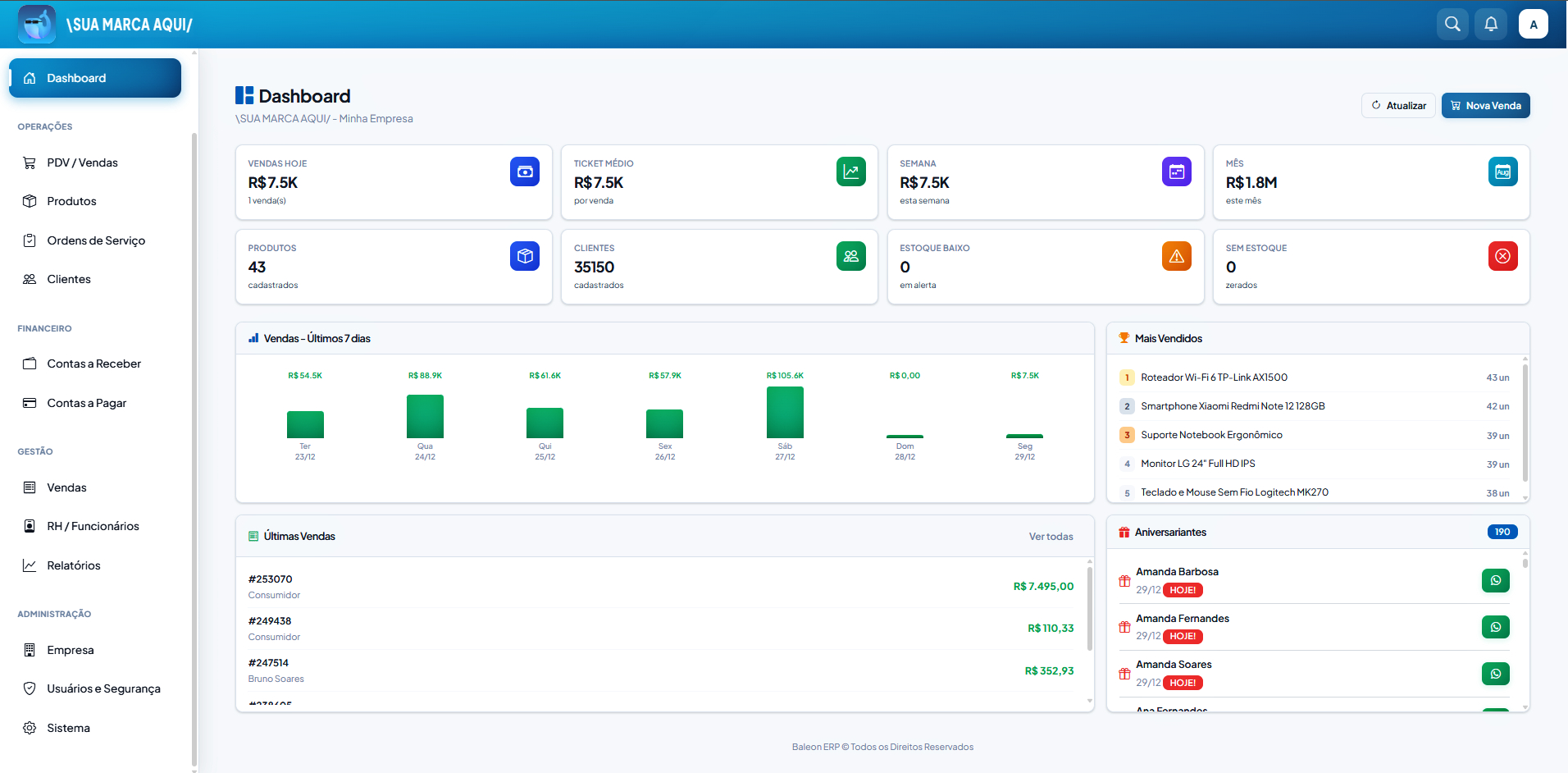 Você abre o sistema e já vê os aniversariantes do dia e as contas a vencer. Nada passa despercebido!